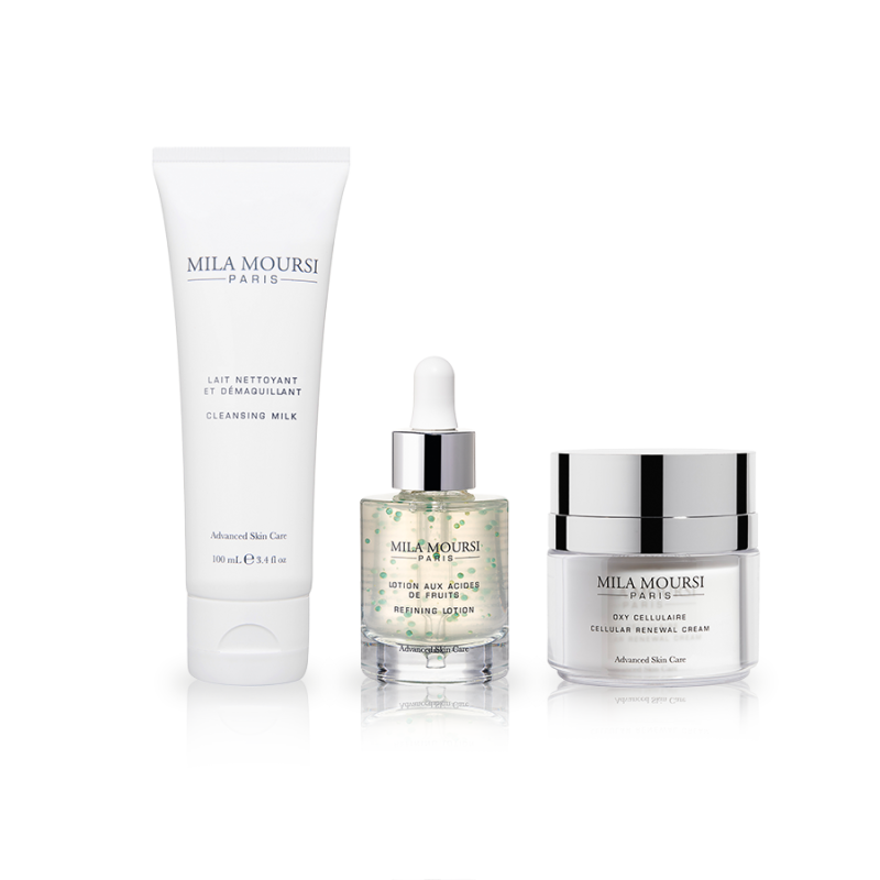 Очищающее Молочко для снятия макияжа с лица и глаз: Наносите молочко ежедневно на кожу лица, шеи и декольте круговыми массажными движениями (руками или ватным диском). Удалите с помощью влажного ватного диска/полотенца, смоченного теплой волой. Освежите кожу всплеском прохладной воды. Подождите пару минут и нанесите тоник. Интенсивный обновляющий Крем - Кислородный Уход с ММ-5 комплексом: Ежедневно днем и вечером наносите на кожу лица, шеи и зоны декольте после сыворотки. Выравнивающий Лосьон с Альфа-гидрокси кислотами: В качестве вечернего ритуала по уходу за кожей нанесите 4 капли лосьона на ладонь и распределите его равномерно на предварительно очищенную и тонизированную кожу лица, шеи и декольте, избегая область вокруг глаз. В случае сухой или чувствительной кожи чередуйте с Восстанавливающим Ночным Эликсиром. Через 5 мин нанесите крем Mila Moursi.